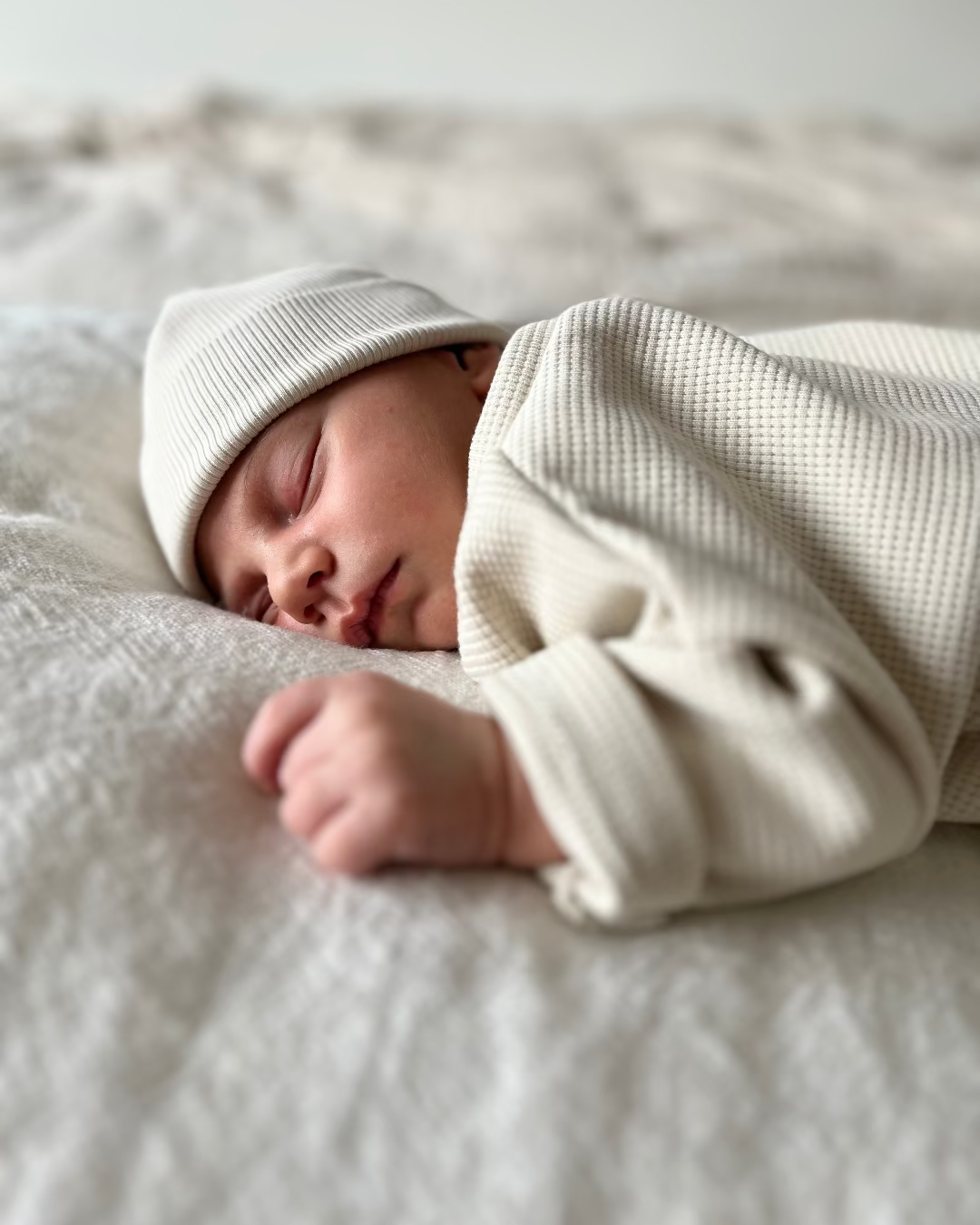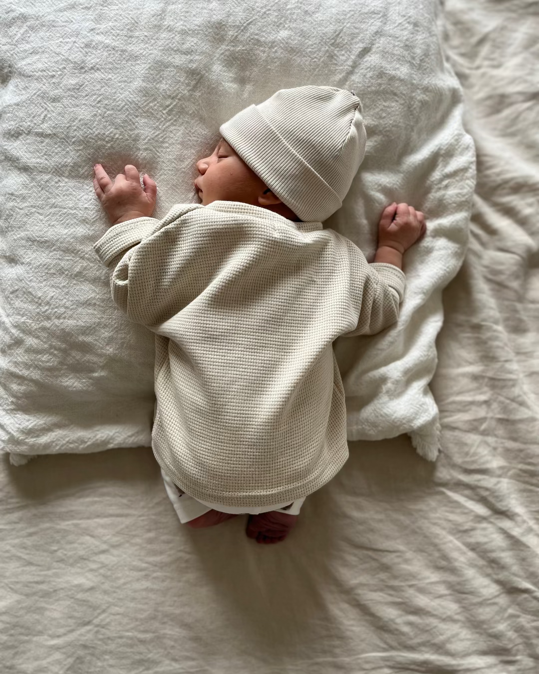 Ein beiger Allrounder. Weich und wärmend. Ob für die ersten Spaziergänge, Kuschelstunden zu Hause oder kleine Abenteuer. Die Beanie besteht aus zwei Lagen weichem Rippjersey, die angenehm wärmen, ohne zu überhitzen. Sie ist keine Wintermütze, sondern ideal für Übergangszeiten oder das ganze Jahr über in geschlossenen Räumen.