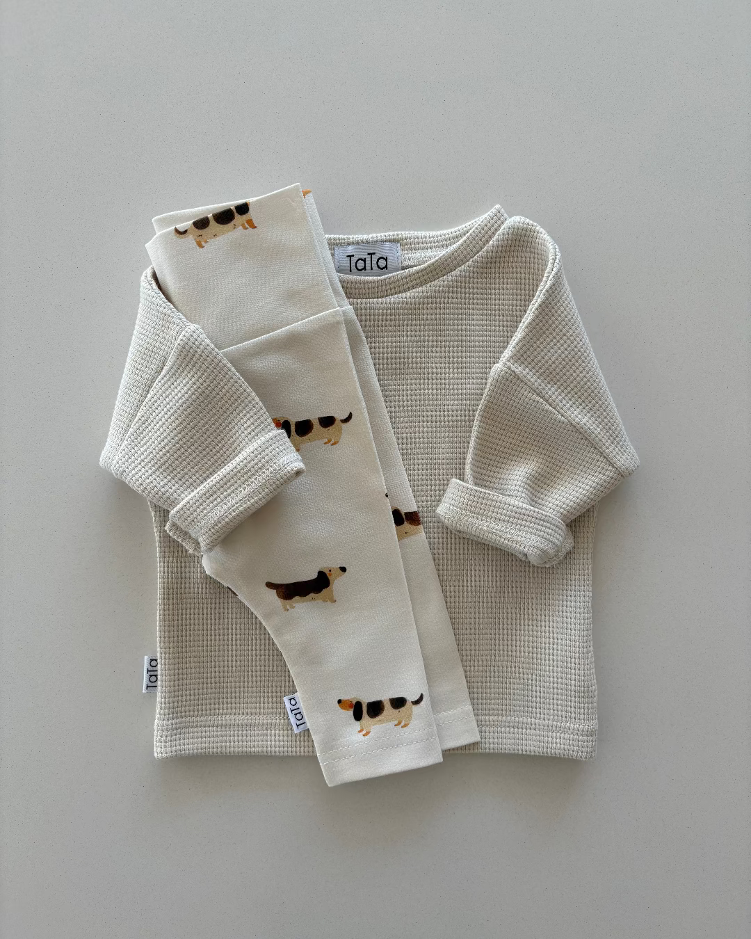 Weich, bequem und mit süßen Hunden. In den kleinen Größen erhältst du die Leggings mit hohem Jersey-Bündchen, ab Gr. 86/92 mit Gummibund. Eine wunderschöne Lieblingssache für kleine Entdecker:innen.